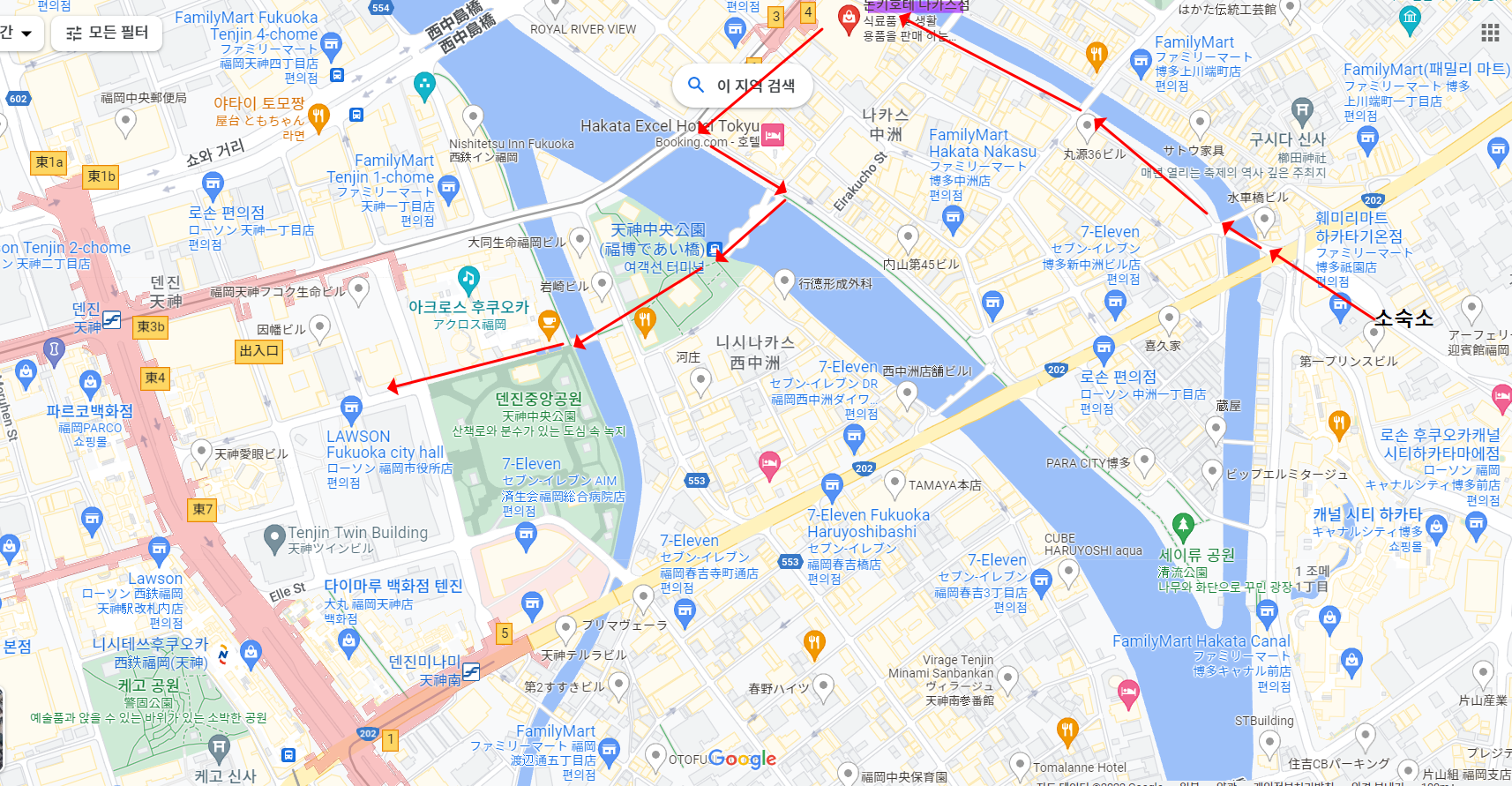 숙소에서 빨간 화살표로 이동하였다.