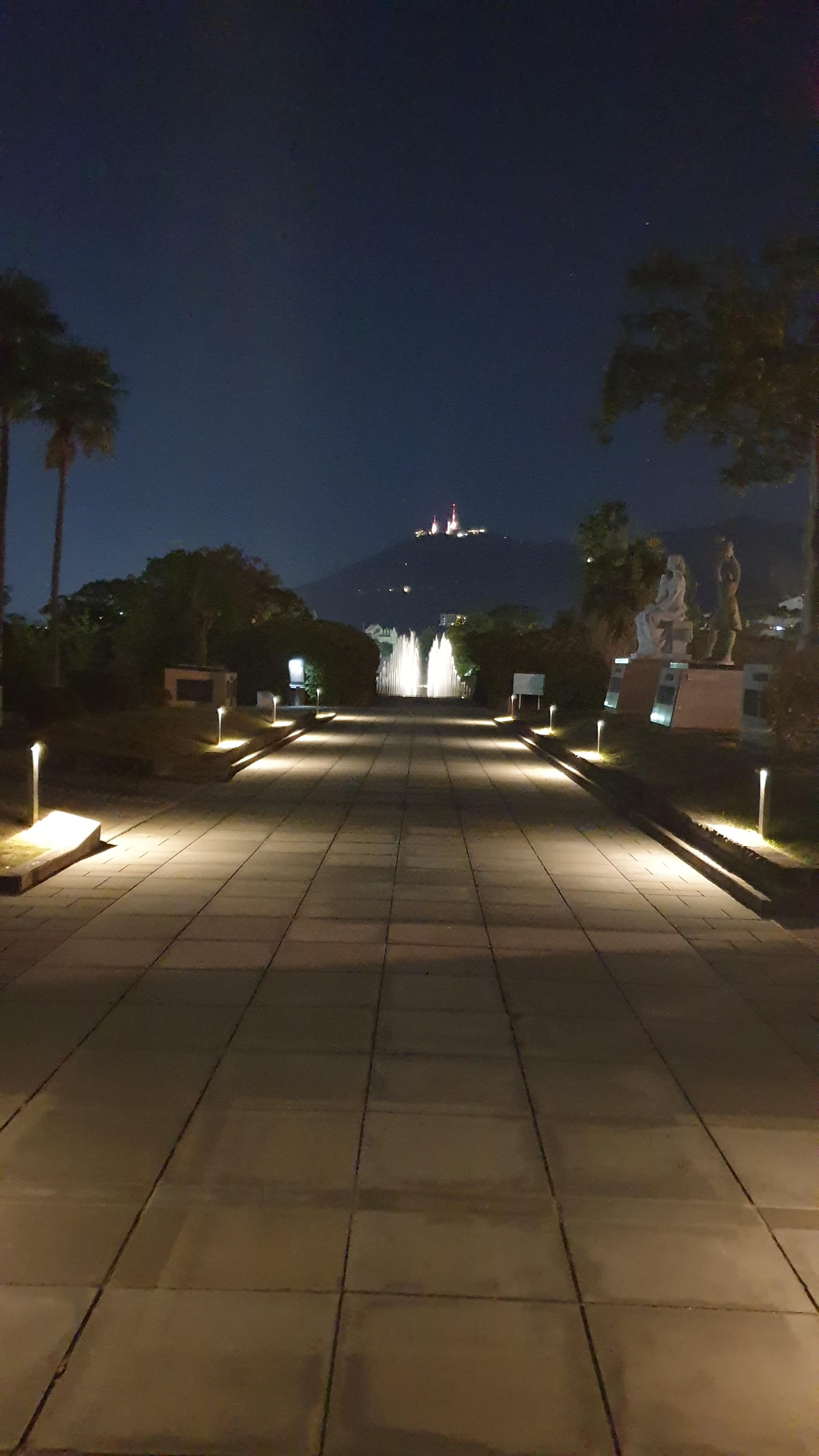 평화의 공원에 서서 평화의샘 분수대와 평화의 상을 바라보며